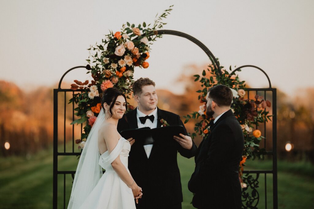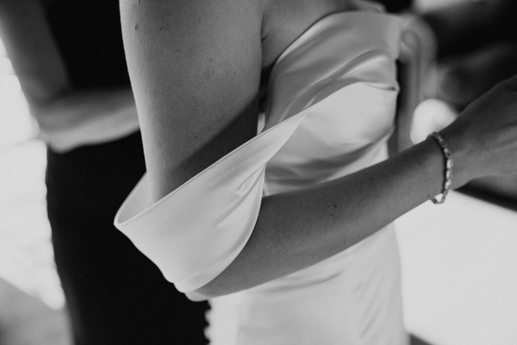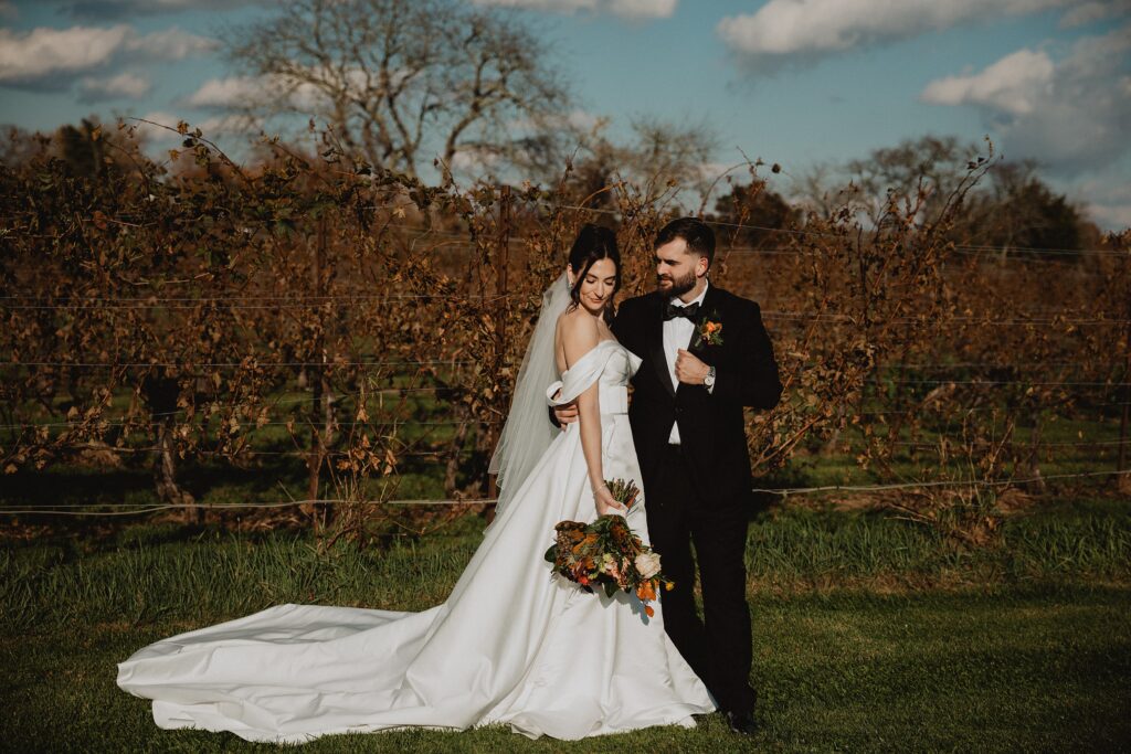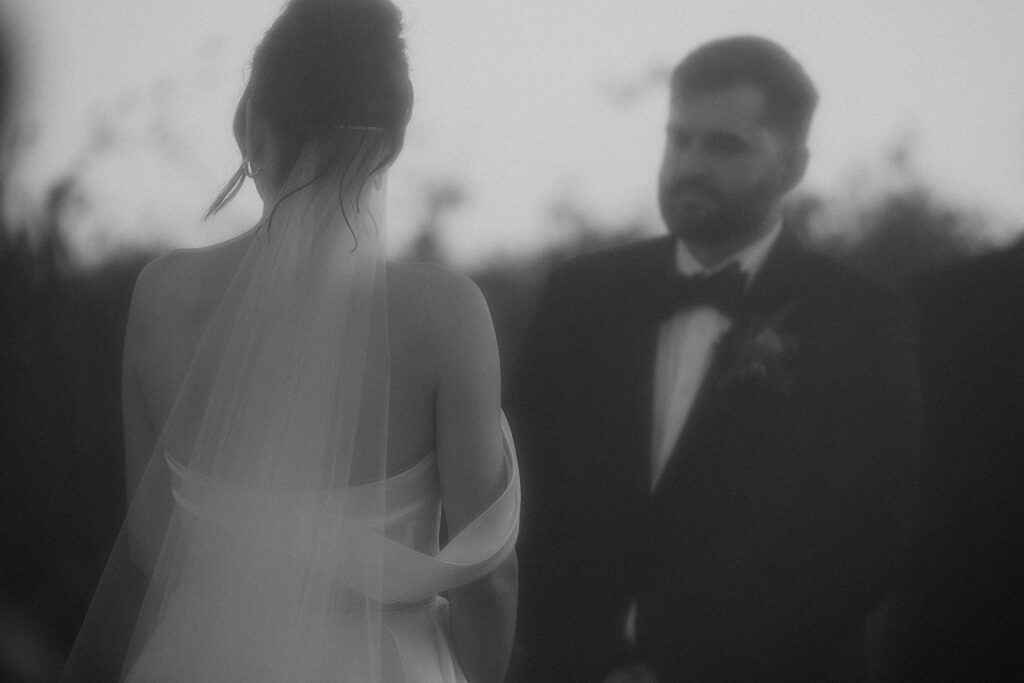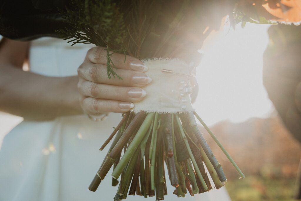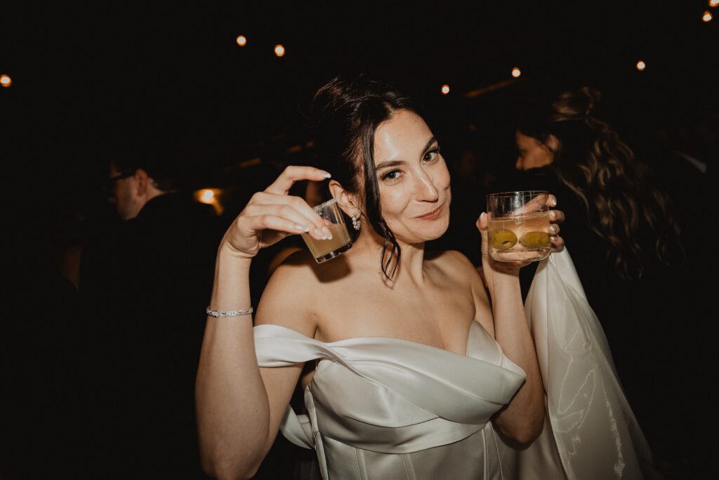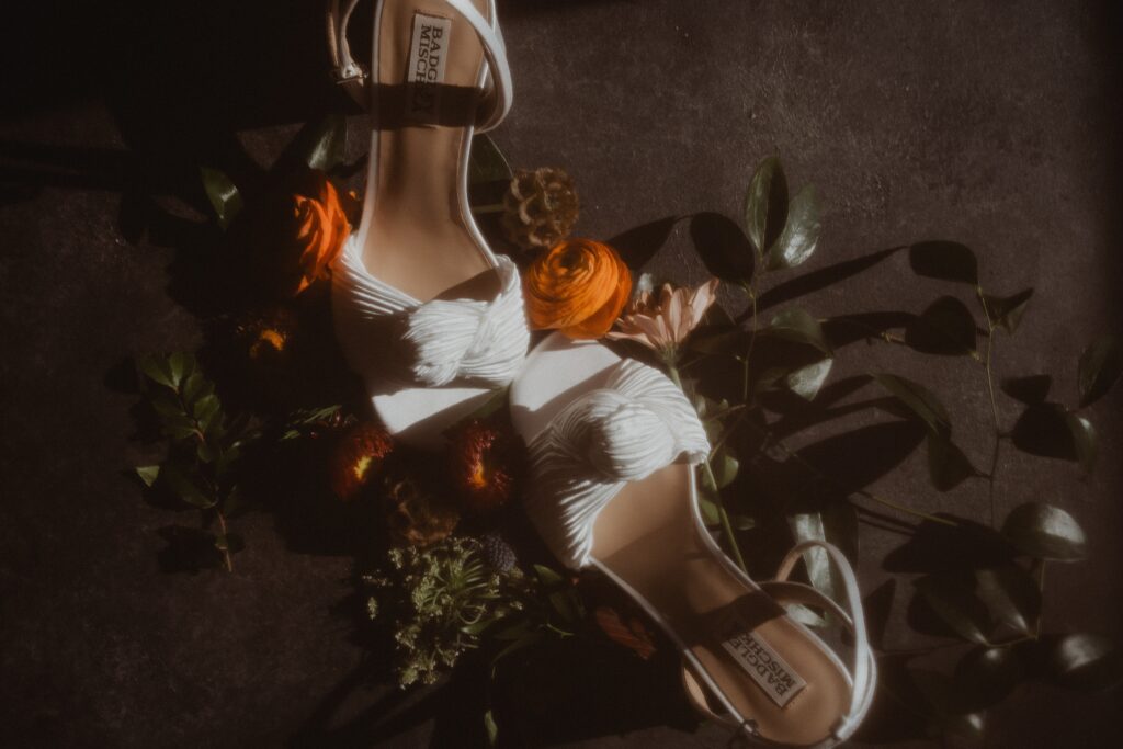 I always fall in love with details. I really enjoy how the little pieces of a wedding day tell their own story. The dress hanging, the rings, the florals, even the martinis. I like showing details on their own and also mixed into the full look. Brea’s gown from Everthine Bridal Boutique looked incredible both ways and her jewelry had its own little moment. The florals from Bantam Blooms added the perfect mix of color and texture with a soft fall vibe that photographed beautifully with my vintage film inspired style.