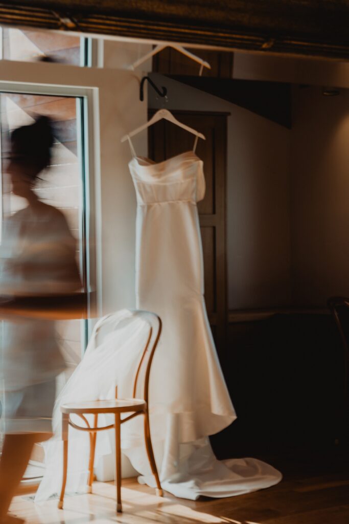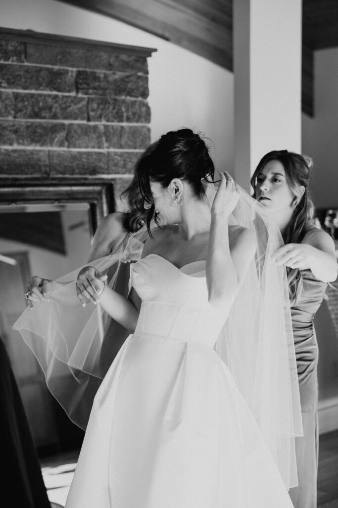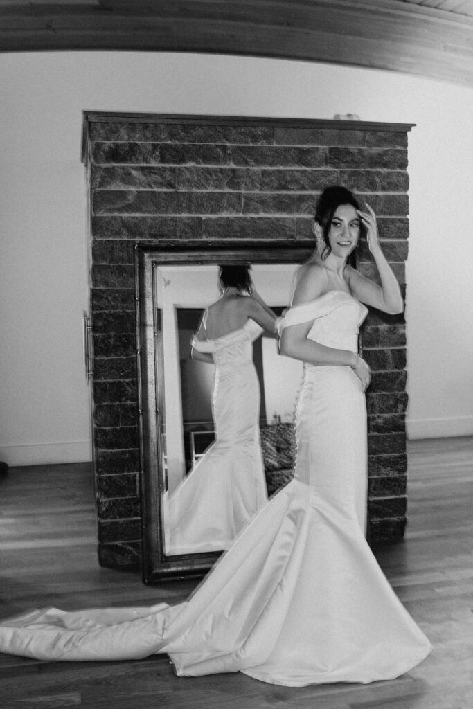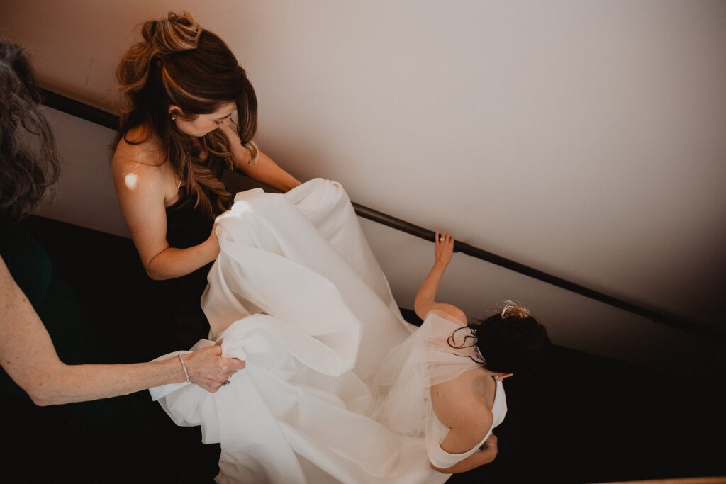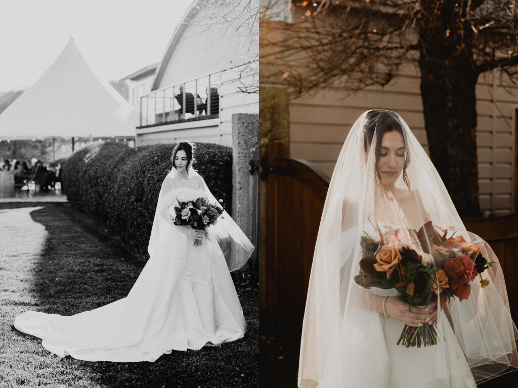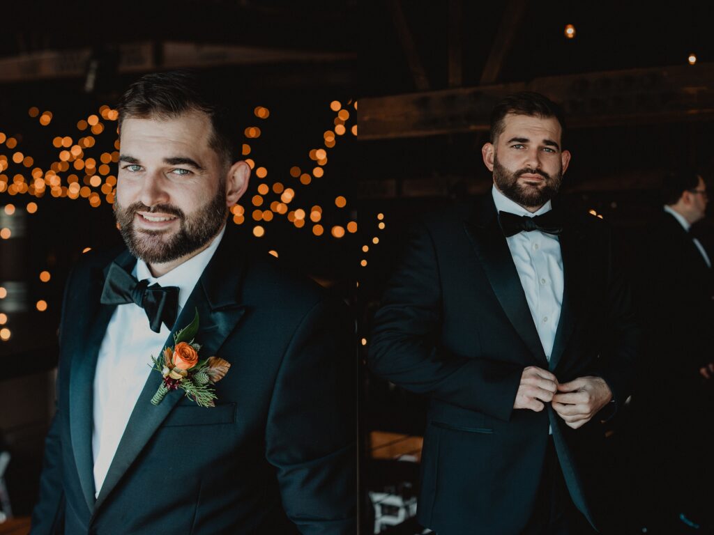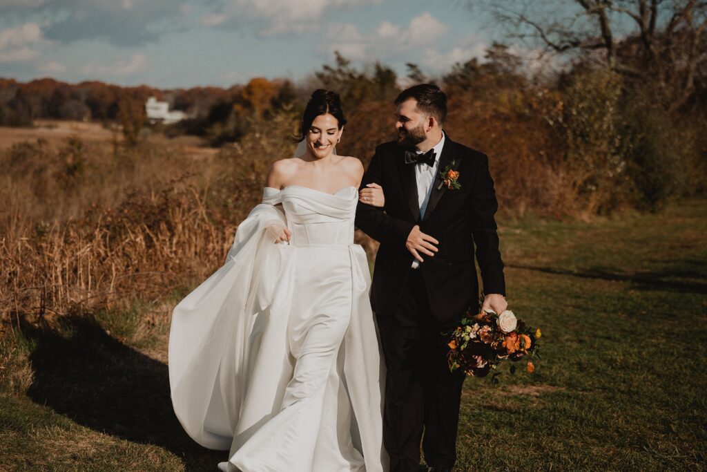 I always fall in love with details. I really enjoy how the little pieces of a wedding day tell their own story. The dress hanging, the rings, the florals, even the martinis. I like showing details on their own and also mixed into the full look. Brea’s gown from Everthine Bridal Boutique looked incredible both ways and her jewelry had its own little moment. The florals from Bantam Blooms added the perfect mix of color and texture with a soft fall vibe that photographed beautifully with my vintage film inspired style.