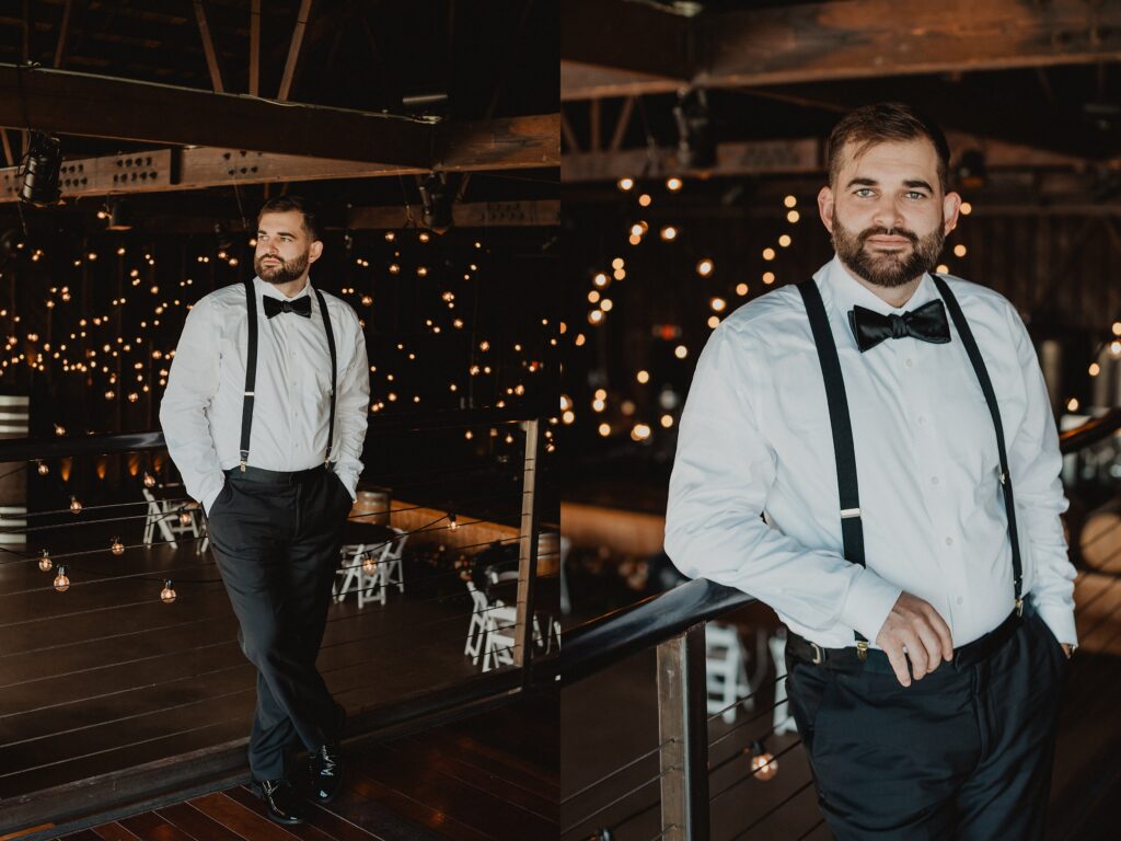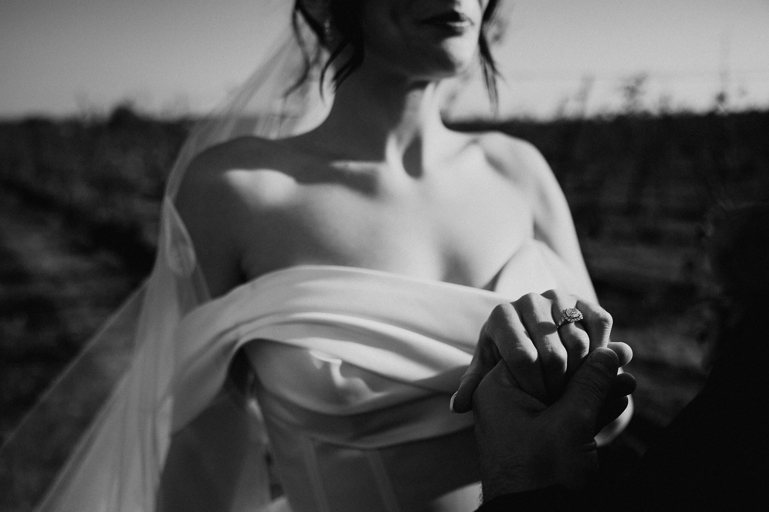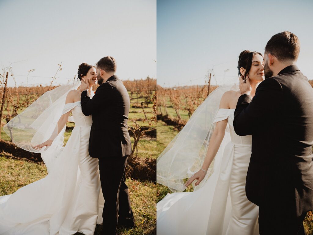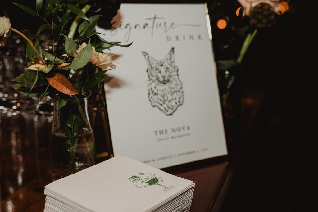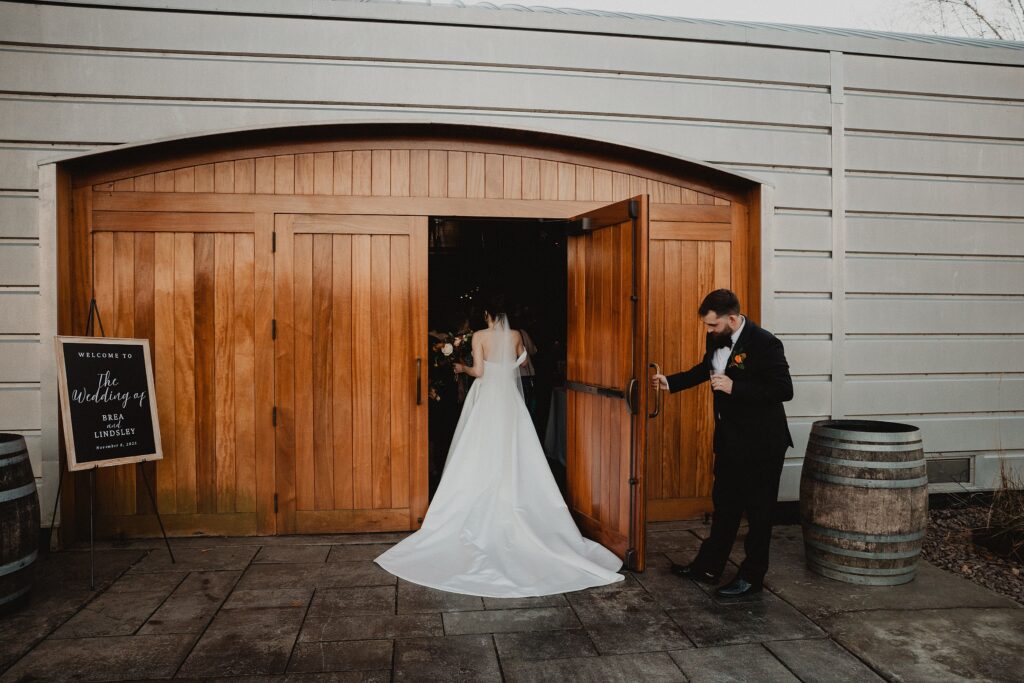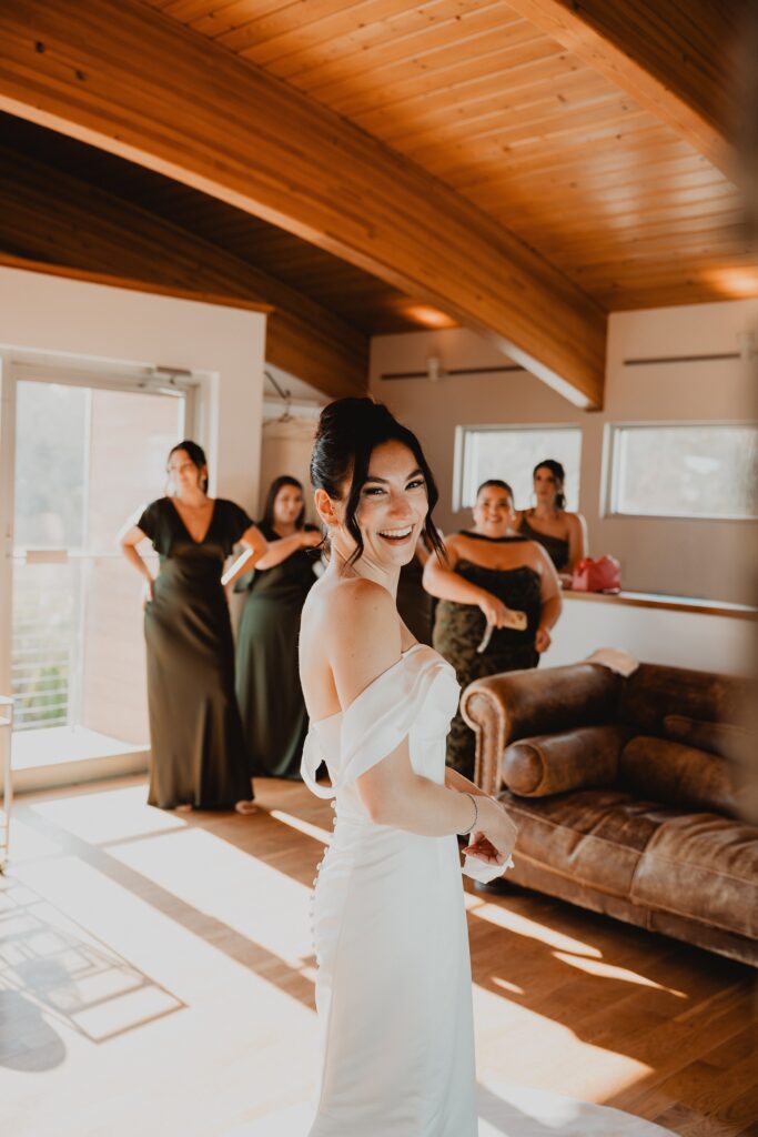 I always fall in love with details. I really enjoy how the little pieces of a wedding day tell their own story. The dress hanging, the rings, the florals, even the martinis. I like showing details on their own and also mixed into the full look. Brea’s gown from Everthine Bridal Boutique looked incredible both ways and her jewelry had its own little moment. The florals from Bantam Blooms added the perfect mix of color and texture with a soft fall vibe that photographed beautifully with my vintage film inspired style.